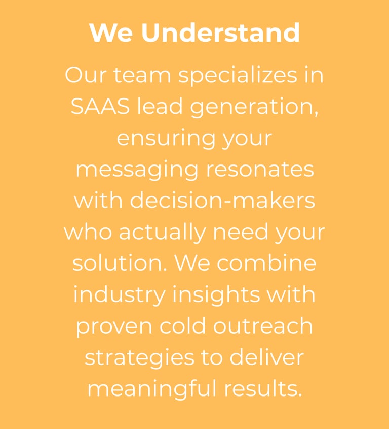 We specialise in outbound for SAAS companies, especially those who are just starting out, meaning we know exactly what works in the space. We also leverage multiple channels to higher-quality leads and better conversions.